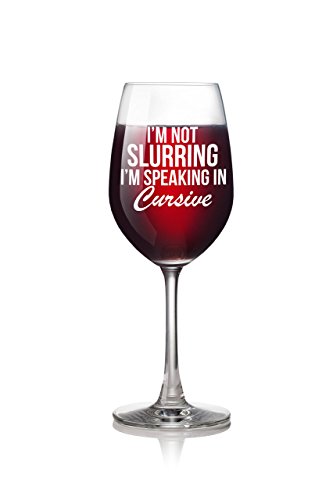 Studio : Smitten by Kristin Publisher : Smitten by Kristin Product Description This hilarious giant 16 ounce wine glass is printed with "I'M NOT SLURRING I'M SPEAKING IN Cursive". This is among the best funny wine glasses on Amazon for the wine lover in your life. We make gift giving easy with this wonderful wine glass! Don't even ask about any other wine glass, you've found the perfect one right here! Our bright white print is easy to see, unlike those etched wine glasses. We go for quality!