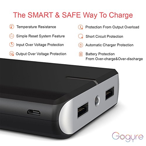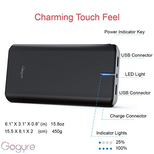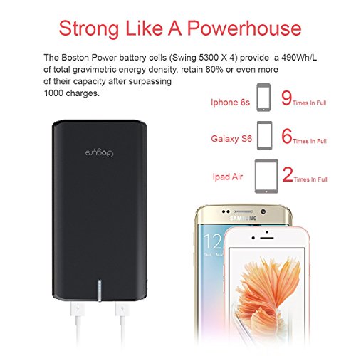 -. Binding : Wireless Phone Accessory -. Brand : Gogyre -. Color : Black -. Feature : Super long Cycle Life- Gogyre portable charger with Boston swing 5300 battery cells offer the highest usable energy density combined with a longer cycle life, Boston cells can undergo over 2000 charge/discharge cycles at 90% depth of discharge (DOD) / 21200mAh High capacity-- charge a iPhone 6s to 9 times, a Samsung s6 up to 6 times, a full charge of ipad air 2 times, recharge itself in 12-14 hours with 2 amp adapter (not included) and the included micro-usb cable / Ultra safe and time saving: Various security system provide reliable security protection. Smart charge with 2 USB port: 5V 2A / 5V 1A, charge your two devices at same time / Ideal for a wide range of applications, including outdoor activities, camping, travel, mountain climbing, maximizes compatibility with Android devices, Apple, Huawei, Sony, HTC and other devices / Package includes: Gogyre G2 21200mAh external battery, micro USB cable, user manual, 18 months warranty and friendly service -. Label : Gyrego International -. Manufacturer : Gyrego International -. Model : G2 -. PackageQuantity : 1 -. ProductGroup : Wireless -. ProductTypeName : WIRELESS_ACCESSORY -. Publisher : Gyrego International -. Size : Small, card, -. Studio : Gyrego International -. Title : Gogyre 21200mAh Portable Charger External Battery High Capacity with Boston Cells 2 USB Output Power Bank for iPhone, iPad & Samsung Galaxy Andorid Phones Tablets & More - Black