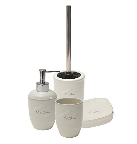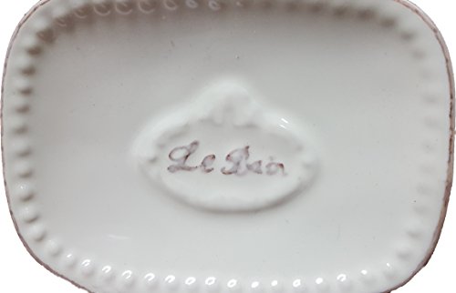 -. Feature : Elegant bathroom soap dish cup in stoneware with vintage design and 'Le bain' in soft focus writing / The soft white color and the textured gray and white details on this soap dish are sure to create a spa-like environment with an opulence that is totally serene and incredibly therapeutic to the senses / Adds a traditional look from France to your decor and complete your LE BAIN decoration with other products of the same collection, like tumbler, soap dispenser or toilet brush holder. / 4.13''L x 3.10''W x 1.5''H, imported from France, made in PRC, the perfect accessory for master bath, guest bath or kids bath. Also suitable for commercial use / Old style effect : the writing 'Le Bain' is slightly rubbed to bring an old style effect to the product