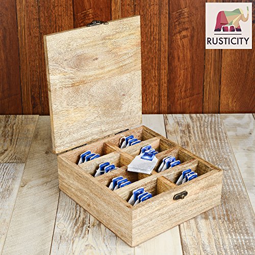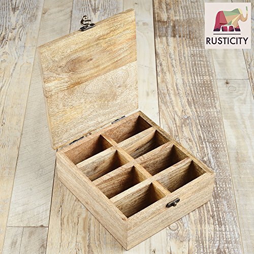 (Rusticity)/Kitchen Dining/Coffee, Tea Espresso/DIRECT FROM USA/Rusticity Wooden Tea Box / Spice Organizer with Lid - 8 Slots | Handmade | (8x7.5 in)