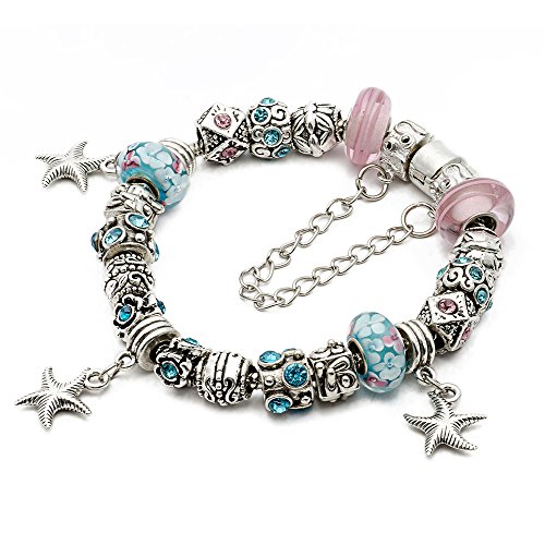 SILVER EUROPEAN CHARM BRACELET 7.9" PINK LIGHT BLUE MURANO GLASS BEADS BRACELETS KIT 26, BY EART