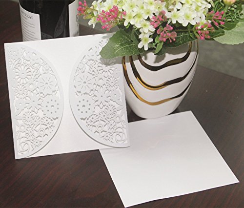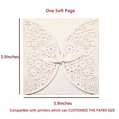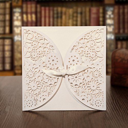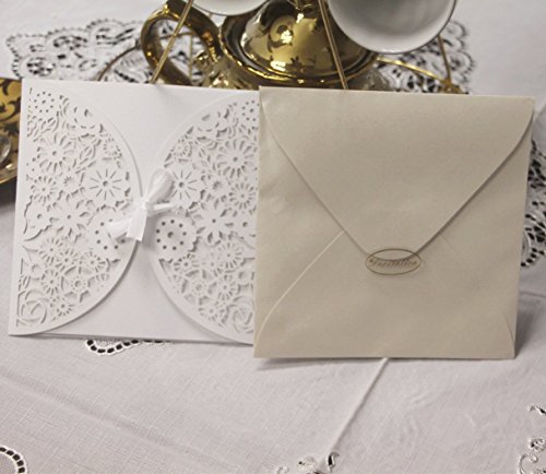 KAZIPA 25 Set Laser Cut Invitation Cards+Envelopes+Inside Sheets+Stickers, Lace Invitation Kit with Ribbon for Wedding Anniversary Baby Shower Birthday Party (White)