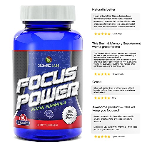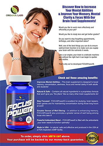 -. Feature : IMPROVE MENTAL ABILITIES - This brain supplement is designed to boost memory, concentration, alertness, focus and mental clarity in both adults and student! / NATURAL AND SAFE - Contains all natural ingredients in a proprietary formula that won't give you "the jitters" like so many other brain supplements do! / STAY FOCUSED - FOCUSPower® is excellent for studying, brain teasers, brain games and for maintaining concentration during those long hours at work! / GREATER SENSE OF WELL-BEING - In addition to enhancing memory, FOCUSPower® also promotes a greater sense of well being among those who take it! / POWERFUL ANTIOXIDANT BLEND - FOCUSPower® is filled with the antioxidants your brain needs to function optimally! Order today and see for yourself. Your purchase will be backed by our money-back guarantee.