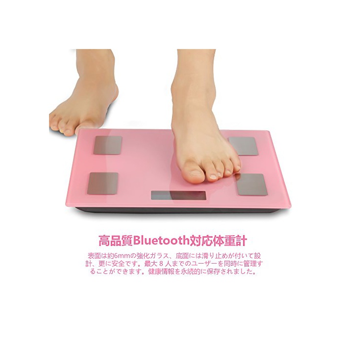 고품질Bluetooth대응 체중계:표면은 약6mm의 강화 유리,저면에는 미끄럼방지가 붙어 설계,더욱 더 안전합니다.최대의 저울의 량180킬로그램400파운드.최대 8 사람까지의 유저를 동시에 관리하는 것 를 할 수 있습니다.가족의 건강관리도 편리합니다.