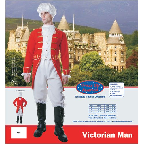 Studio : Dress Up America Publisher : Dress Up America Binding : Apparel Product Description This Adult Victorian Male Costume set is sure to take you back a few Years. Product Includes: long jacket with attached vest, pants, boot cover and neck scarf. Set packaged in a deluxe garment bag which closes with zipper for easy and secure storage. Realistic looking, theatrical quality. Pants feature an elastic waistband for comfortable fit . Very nice quality and comfortable to wear. Available in Small, Medium, Large, X-Large and XX-Large Sizes, also available in kids sizing. Versatile: Great for Halloween stage, kids parties or one-on-one play time year round Additional Features: Very durable: resistant to most chemicals, stretching and shrinking, wrinkle resistant, mildew and abrasion resistant. Polyester is hydrophobic in nature and quick drying. It is easily washed and dried. Why Dress Up America: Dress Up America dedicates to provide Amazon customers with excellent service and good quality products. Dress Up America is proud to be an independent company featuring a beautiful collection of superb quality Halloween and year-round costumes. We feature fancy dress costumes, wigs, exciting accessories in all sizes ranging from infants, boys, girls, teens, men and women. We pride ourselves in offering only the highest in quality so please order with confidence: Being an authorized seller with thousands of satisfied customers, we are here to serve you. Please contact us with any questions. We appreciate your business. 0
