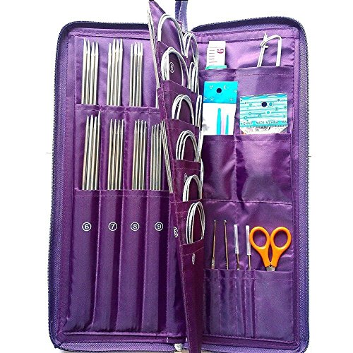 NICELY PACKED: Comes nicely presented in a reusable bag in an organized order. Inside is as shown in the photos. It's a comprehensive set of DPN and a set of circular needles. A good starter set.