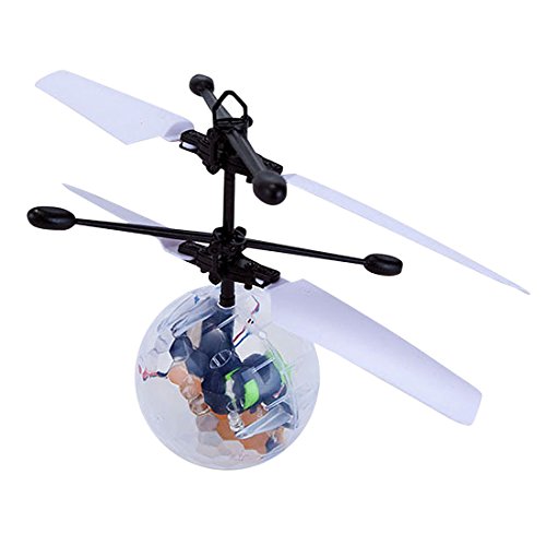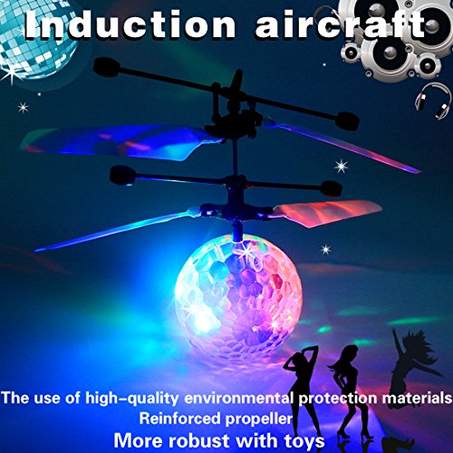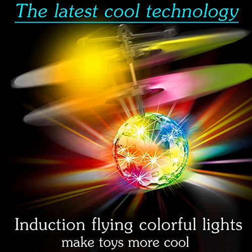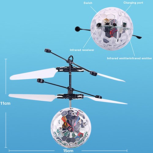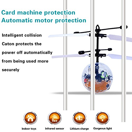 Novelty?Designed, flying ball is a fantastic playing toy for little boys and girls, ?enriching kids' playing life,great gift for your kids. Features: 1. ?flying ball comes with two sets of blades and two balance beams to help fly steadily and keep balance in the air. The blades are well-made with flexible and tough features; the beams are updated and reinforced. All of these make the flying ball resisting from damage in collision. 2. The flying ball is equipped with colorful LED lights inside which provide a beautiful display when flying. ?When it is on,the rainbow color makes it amazing and shinning in the air, which will attract kids' attention greatly. It will be more beautiful at night.it can sparkle and shine in darkness. 3. The ball is rechargeable and comes with a USB charger, which offers consistent playing. When charging, the red light will turn on to show it is under charging status. Usually the charging time of the ball shall be 10 or 20 minutes, so please don't leave it charging for more than 30 minutes. How to operate !! 1. Simply place the ball in your open palm, then switch the power on, and the flying toy will fly into the air after two or three seconds. You can control the flying height with your hand before letting it go. 2. After the ball has flown out of your hand it will quickly rise up and then at some height it will start to descend; however, when you place your hand underneath, it will fly up again. The sensitive motion sensors underneath the ball control the power to the rotors and when it senses your hand it will power up. It is like a flying volleyball when you do this, bring you unusual playing experience. Note: It won't chop off your finger or anything, but it may be make your kids getting fingers caught in because it stings. So I would suggest this for older kids, or with Parental supervision for young ones. 0 |