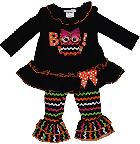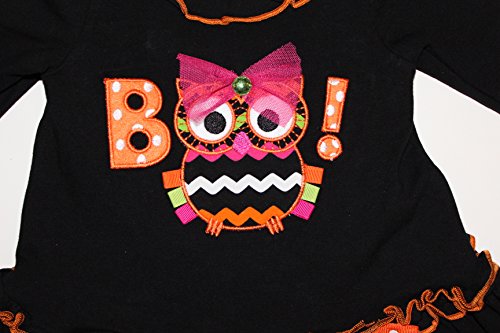 -. Binding : Apparel -. Brand : Bonnie Jean -. Color : Black -. Department : baby-girls -. Feature : Adorable 2-piece set outfit by Bonnie Baby (line from Bonnie Jean). The long sleeve dress features solid black knit throughout, black orange trim ruffled under round neckline, chevron OWL BOO! with a bow applique' at the front center. Black orange trim ruched around the insert ruffled hem. Comes with a coordinating multi-color chevron & double ruffled leggings. A fun and stylish for your little one to wear during the Halloween & Fall season. Dress and leggings are mixture of 95% cotton & %5 spandex. Bonnie Jean is a great brand sold in high end department stores and run true the size. -. ProductGroup : Apparel -. ProductTypeName : SHIRT -. Title : Bonnie Jean Girls Halloween Owl BOO Dress Legging Outfit, Black