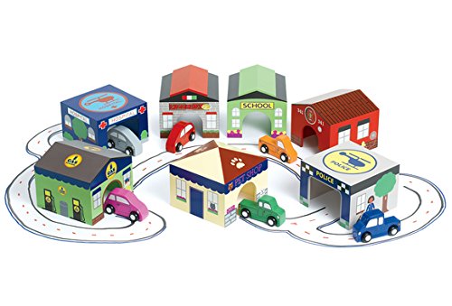 -. Feature : Set includes fire station, hospital, school, police station, pet shop, gas station and pizzeria / Entrances and exits that cars can drive through / Adds a realistic touch to your block cities and towns / Blends role-play with block play / Compatible with our vehicles: trucks (#TRUCKS) and cars (#CARS2) sold separately