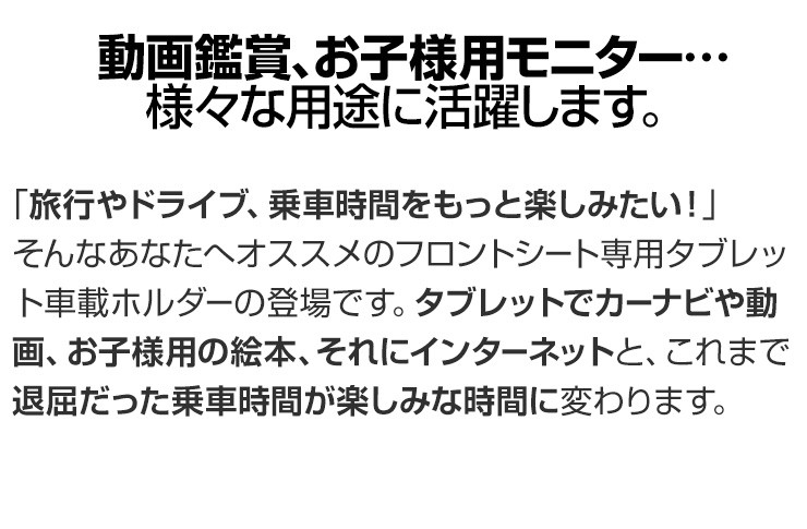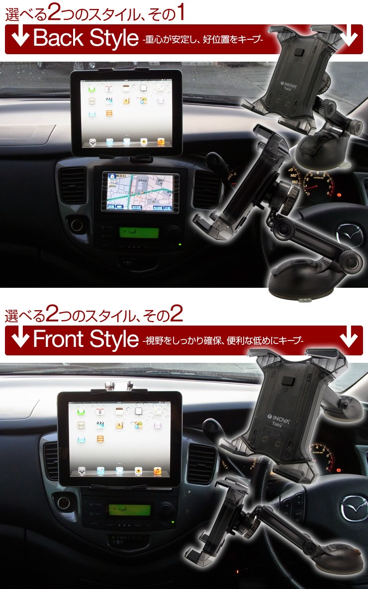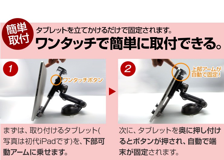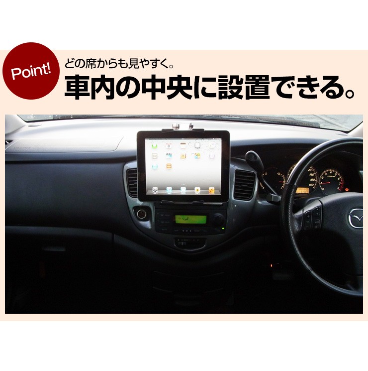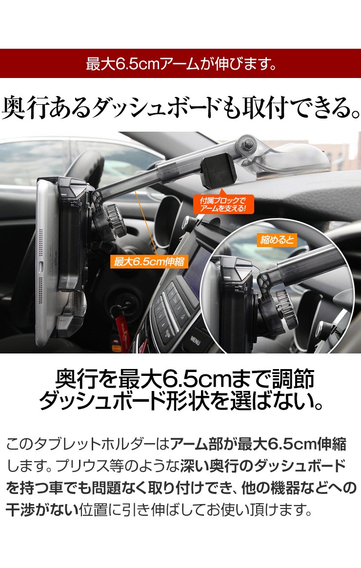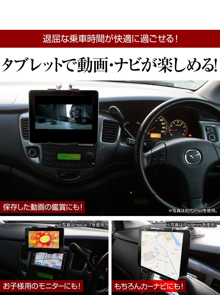 | 車のダッシュボードに強力固定!ネクサス7、Galaxy Tab、Kindle Fire HD/7/6、Fire HDX 8.9/7、iPad mini、iPad Air/4/3/2/1等など設置可能なタブレット車載ホルダー! 【製品特徴】 ●タブレットをナビや動画閲覧などに使える! ●幅約11.5~19cm、厚み1.4cmまでの各社タブレットPCに対応! ●カーナビの様にセンター配置できる! ●縦横上下角度調整できる! ●ホルダーに立てかけ、ワンタッチで固定! ●ホルダーを見やすい高さに調節可能! ●ボディとホルダー間の長さを最大6.5cm調節できるから、様々なダッシュボードに対応! ●繰り返し使える真空吸盤でダッシュボードに直接固定可能! ※ダッシュボード形状によって、取り付けできない車種があります。 横から見た際に接地面が『曲面』『突起』がある場合はできません。 ※必ずお持ちの車のダッシュボード周辺のサイズをご確認お願いします。 |