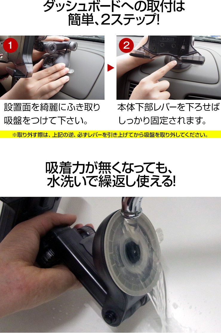 | ご注意事項 | ※ダッシュボード形状によって、取り付けできない車種があります。 横から見た際に接地面が『曲面』『突起』がある場合はできません。 ※必ずお持ちの車のダッシュボード周辺のサイズをご確認お願いします。 |