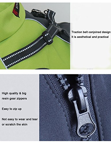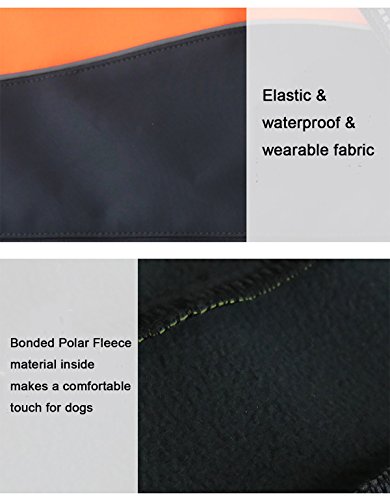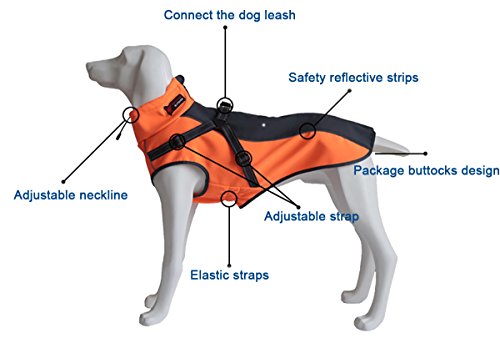 Advantage 1. MATERIAL: Polyester Fiber, Bonded Polar Fleece material inside makes a comfortable touch and keep warm for your dogs. Elastic, waterproof and wearable outer layer keep your dogs warm; 2. DESIGN CREATIVE: Zipper on the back, easy to be put on and take off. Traction belt conjoined design, easy to control your dog. Safe and reflective strips, keeps a safety walking in the night; 3. Adjustable Extended Collar Design: Prevent cold wind get inside the coat effectively.