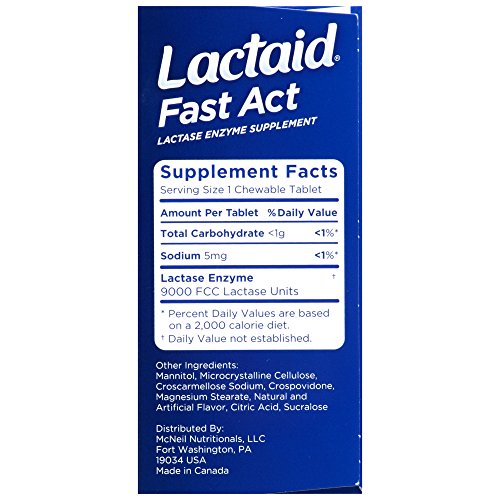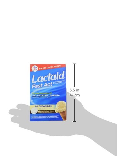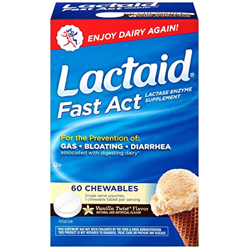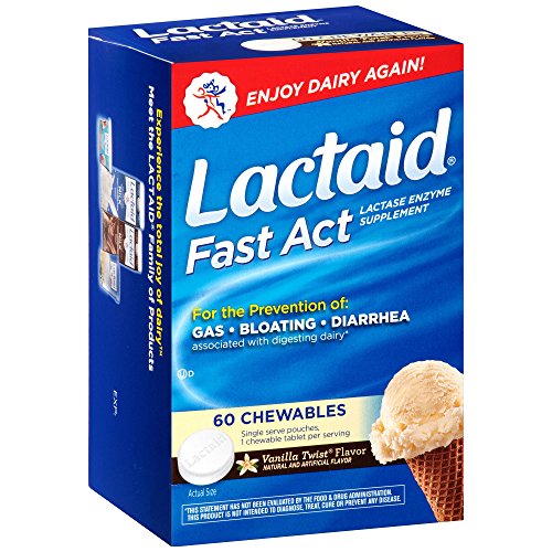 Lactaid Fast Act Chewables start working when you take them with your first bite or sip of dairy food, helping prevent the gas, bloating, and diarrhea that many people experience after eating foods containing dairy. With the natural lactase enzyme, this dietary supplement helps prevent symptoms associated with lactose intolerance by breaking down milk sugar (lactose), so dairy foods are easier to digest. These tasty chewables start working with your first bite of dairy. Certified kosher, Lactaid Fast Act Chewables have a smooth Vanilla Twist Flavor. This package comes with 60 single-dose pouches.Feature