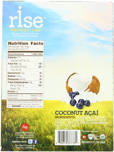 Studio : Divine Foods, Inc. Publisher : Divine Foods, Inc. Binding : Grocery Product Description Rise Bar believes life is complicated enough, so each Rise Bar is made simple with only the essential ingredients needed to fuel your busy life. ?RiseBar Energy bars are a delicious blend of organic super fruits and nuts - the perfect vegan snack.?Every Rise Bar is mixed and packed in small batches daily in their California Kitchen. Rise Bar Energy bars are made with only real food ingredients and are vegan, organic, non-GMO, soy-free, gluten-free and kosher. Rise Bars NEVER use artificial sugars, preservatives or sugar alcohols.? That’s the Rise Bar promise to you. Box of 12 individually wrapped bars, 1.6 ounces each. 0