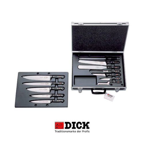 Product Description Perfect for chefs and culinary students, this high quality set has it all. With all of the knives that a budding professional needs, this 12-piece collection from the fine cutlery specialists at F. Dick is perfect for those starting. Get all of the necessary tools with a quality that can't be matched. Features: All pieces store neatly in a durable metal case. All components are superior quality and tough enough for regular commercial use. . Specs: Case measures: 39" x 14 1/2" x 4 1/2". Ships within 2 business days. Manufacturer's Warranty: One year manufacturers warranty. Includes: 5" Boning knife. 8" Chef's knife. 12" Chef's knife. 4" Decorating knife. 6" Meat fork. 10" Narrow blade slicing knife. 3 1/2" Paring knife. 10" Sharpening steel. 6" Slicing knife. 10" Slicing knife. 10" Spatula. . 0