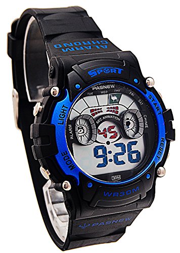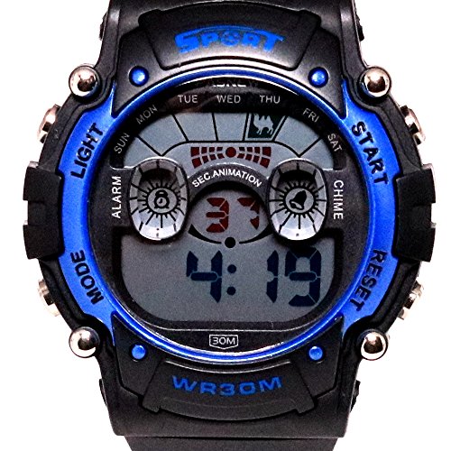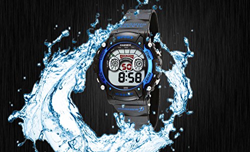 -. Feature : 1.PRECISE TIME KEEPING: Japanese Quartz and Electronic High quality movement, digital display, provide precise and accurate time keeping.Long Battery Life, kids watches designed for boys and girls 5-12 years old gift / 2.COMFORT: High Quality Germany Imported PU Resin Strap, the strap is soft and comfortable and environmental friendly.Suitable for wrist 14cm - 19cm. Safe and non-toxic plastic strap, no harm to children's Skin. It is also very suitable for outdoor sports. / 3. WATERPROOF FOR DAILY USE: 3ATM, 30M Water Resistant, HANDWASH, SWIMMING, NO PROBLEM ! Feel free to wear the watch when you are showering, swimming. NOTE: Please DO NOT press any buttons in the water or wear this watch for longtime underwater activities - such as diving, ect. Too much water contact or usage in extreme Hot or Cold temperature will shorter watch life. / 4.HIGHLY TRANSPARENT RESIN GLASS: The glass is made from the highly clear resin material imported abroad and sealed with the case by high frequency machine. So that the glass is extremely hard and pressure-tolerant. / 5. MULTI-FUNCTIONAL: Design Calendar Date Window, Time/date, 12/24 hour format, 30M Waterproof, Noctilucent, EL Back Light Display, Shock Resistant, Stopwatch.Easy to set up. It is able to operate it by children own. Nice watch for elementary age kids.Best present for your kids.