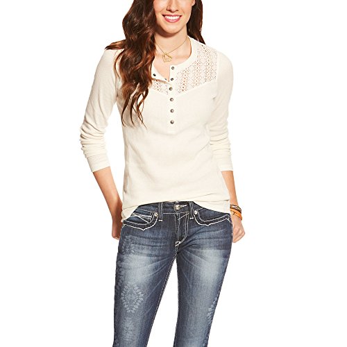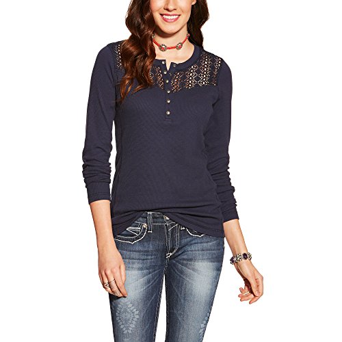 Studio : Ariat Womens Code Publisher : Ariat Womens Code Binding : Apparel Product Description Ariat's daisy Henley gets expressive with stretch thermal and a lace trim yolk. Be casual and comfortable in the daisy's thermal knit material tailored with a traditional Henley placket, western wheel snaps and raglan sleeves. 0