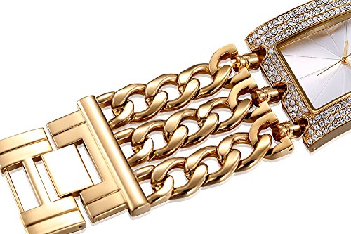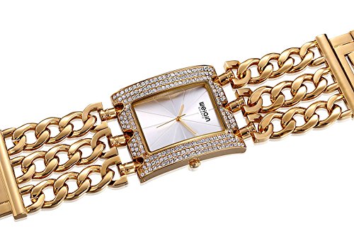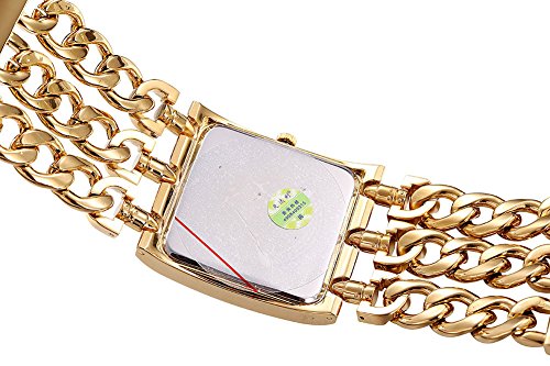 -. Feature : Multi-color available! This playful and unique watch lends a trendy hint of vintage style to any outfit. / 3 pcs gold PVD chain with an additional extension bracelet clasp, the length of watch strap is self-adjustable. / Water resistant 3ATM or 30 meters ?30 feet),will withstand splashes of water or rain but should not be worn while swimming or driving. / Square dial surrounded by 198pcs Czechic crystial, matt silver dial face with creative radiative linear index, this feminine watch is easy to match with any outfit. / Imported Quartz Movement: Quartz movement operates on a battery power source, which offers long-lasting usage for up to 12 - 24 months. The quartz crystal oscillates at a consistent rate and requires no winding whatsoever, which guarantee's accurate readings every time.
