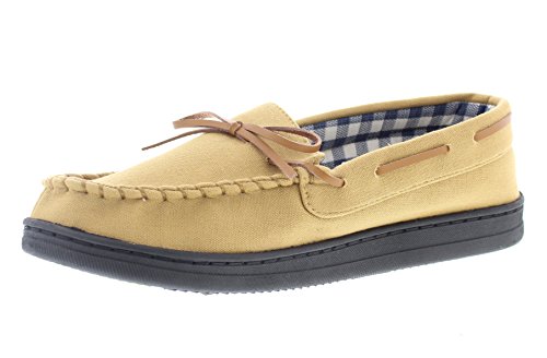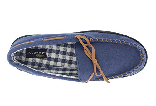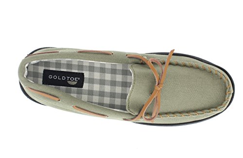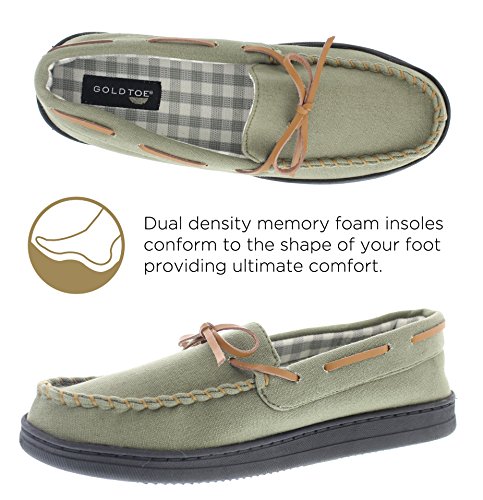 -. Binding : Apparel -. Brand : Gold Toe -. Department : mens -. Feature : Casual and lightweight slip on slipper shoe for men for warm weather days / Stylish and comfortable summer weight moccasin with boat shoe round-the-collar lacing. Insole of slipper is lined with gingham check print fabric / Designed with memory foam insole for all day customized cushioned support / Durable rubber traction sole for versatile wear as indoor house shoes and outdoor slip-on oxford loafers / This men's plaid lined moc toe slipper is available in olive green, navy blue, and tan brown and in sizes S, M, L and XL -. Model : Nathan -. ProductGroup : Shoes -. ProductTypeName : SHOES -. Title : Gold Toe Men's Nathan Lightweight Cotton Canvas Moccasin Memory Foam Slipper Loafer Shoes