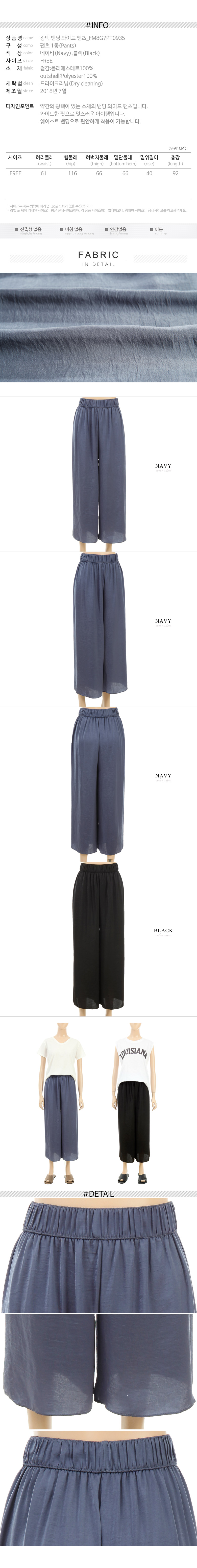 | 약간의 광택이 있는 소재의 밴딩 와이드 팬츠입니다. 웨이스트 밴딩으로 편안하게 착용이 가능합니다. 웨이스트 밴딩으로 편안하게 착용이 가능합니다. |