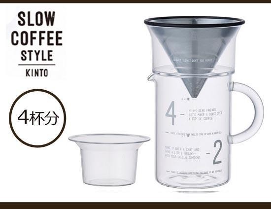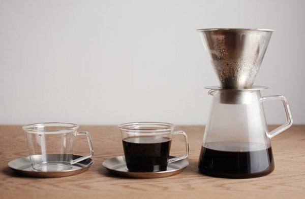 | ステンレスフィルターとブリューワー、ガラス製のジャグのセット。コーヒー豆を計量できるホルダーは、使用後のブリューワー置きに。フィルターとブリューワーを直接マグに載せ、コーヒーをドリップすることもできます。 |