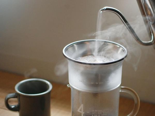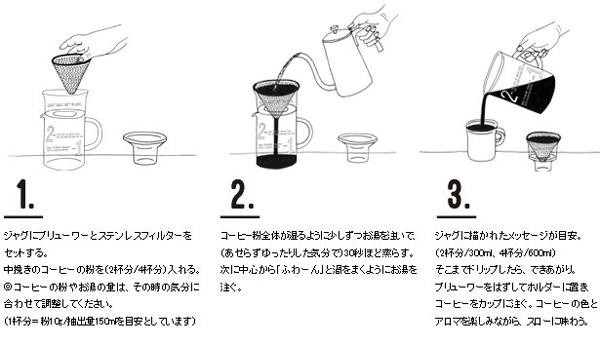 ステンレスフィルターとブリューワー、ガラス製のジャグのセット。コーヒー豆を計量できるホルダーは、使用後のブリューワー置きに。フィルターとブリューワーを直接マグに載せ、コーヒーをドリップすることもできます。 |