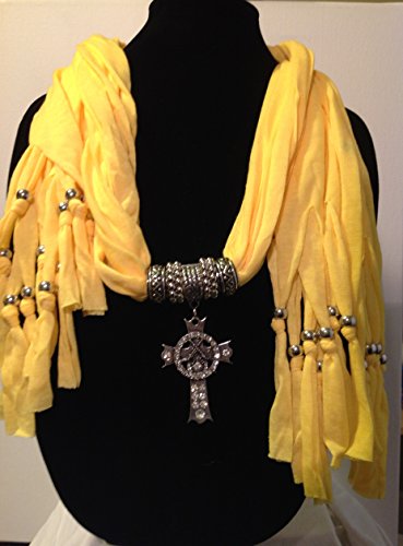 Product Description Yellow Scarf with silver bead accent on tassel ends. Located in the middle is a clear crystal jeweled angel winged cross with silver beads located on either side. 0