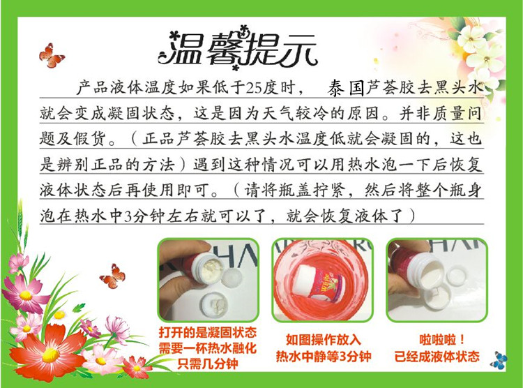 如果产品温度低于25度就会出现凝固状,这是因为天气温度较冷的原因,并非质量问题及假货,遇到这种情况可以用热水泡一下再使用即可。请亲们息知!