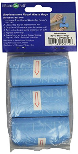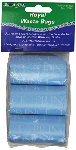 Studio : PetEdge Dealer Services* Publisher : PetEdge Dealer Services* Binding : Misc. Product Description Clean Go Pet royal waste bag add a touch of style to a routine pet cleanup job. Each pack contains three 20-count rolls of pet waste cleanup bag. Set of three bag is packaged in a polybag with a header card. Clean Go Pet royal waste bag is available in blue "Prince" design. Directions for use: Unscrew bone-shaped waste bag holder's end cap. Loosen top bag of replacement roll. Drop in roll (fits neatly over center rod). Turn roll so top bag is facing dispenser on side. Replace screw cap. Partially tug an-inch or less of the top bag out of the dispenser opening. Bag measures 12-1/2-inch length by 9-inch width. 0