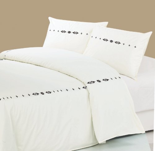 - Southwestern embroidered accents on cream duvet