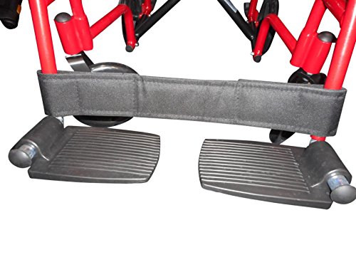 Product Description Item # 472 Wheelchair leg strap fastens securely around the footrest for better comfort. strap loops around the wheelchair footrest to help keep your legs in position from slipping off. Size: 19" width it will adjust as wide as 21" 0