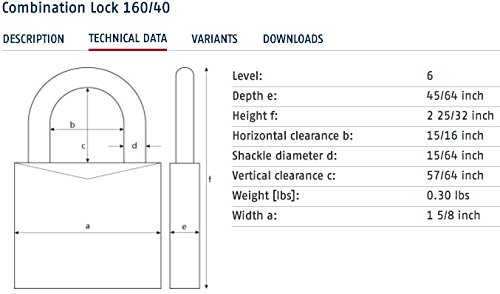 -. Binding : Tools & Home Improvement -. Brand : ABUS -. Color : Chrome -. EAN : 0078217126110 -. Feature : Double bolted hardened steel shackle resists hacksaw attacks / Heavy duty solid zinc body with chrome plating for weather resistance / No tools required to change combination / 1,000 possible combinations -. Label : ABUS -. Manufacturer : ABUS -. Model : 160/40 B -. MPN : 160/40 B -. NumberOfItems : 1 -. PackageQuantity : 1 -. PartNumber : 160/40 B -. ProductGroup : Home Improvement -. ProductTypeName : HARDWARE -. Publisher : ABUS -. Size : 1.5-Inch -. SKU : 160/40 -. Studio : ABUS -. Title : ABUS 160/40 All Weather Chrome 3-Dial Resettable Combination Padlock -. UPC : 078217126110 -. Warranty : If an ABUS product fails to work properly due to a manufacturing defect, return it to ABUS postage pepaid, and we will return it repaired or replaced at our discretion. ABUS prodcuts are warranted for specific periods of time from date of purchase. Specific warranty periods appear on the packaging.