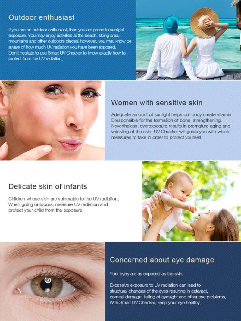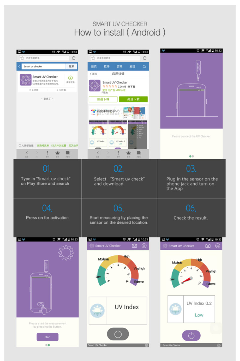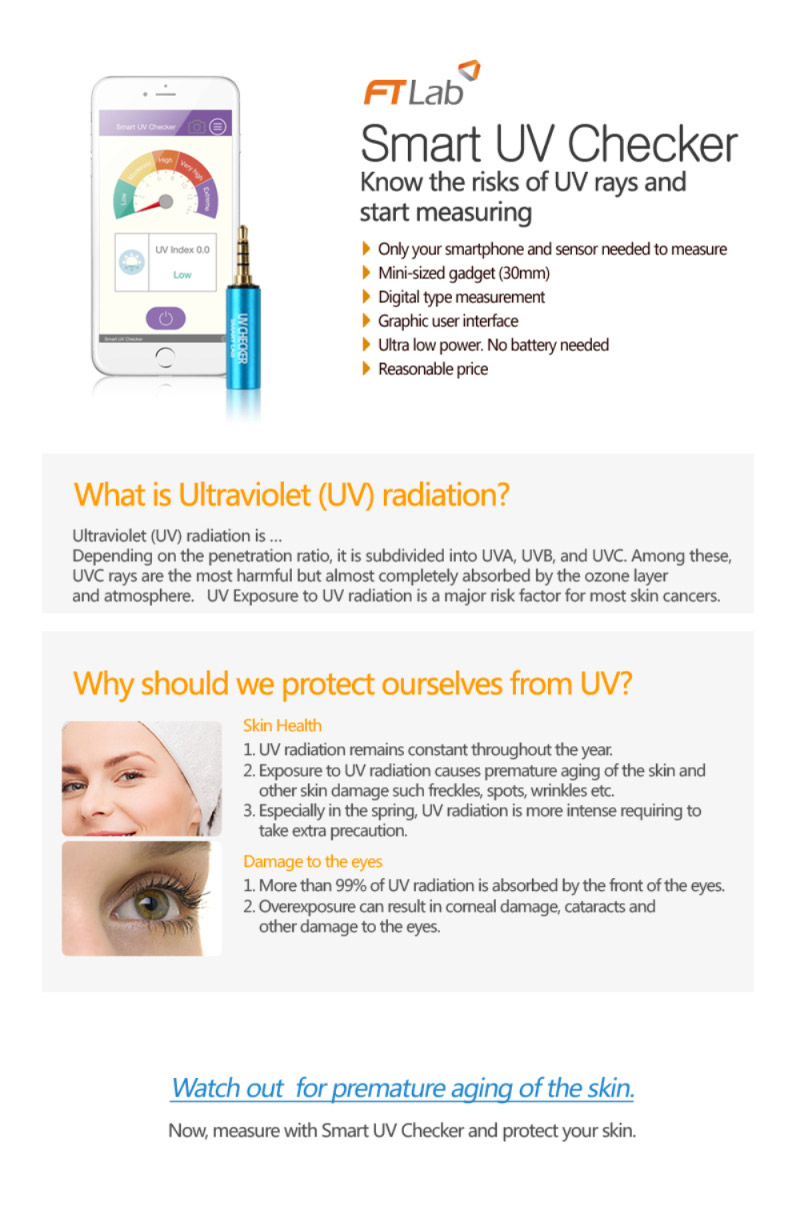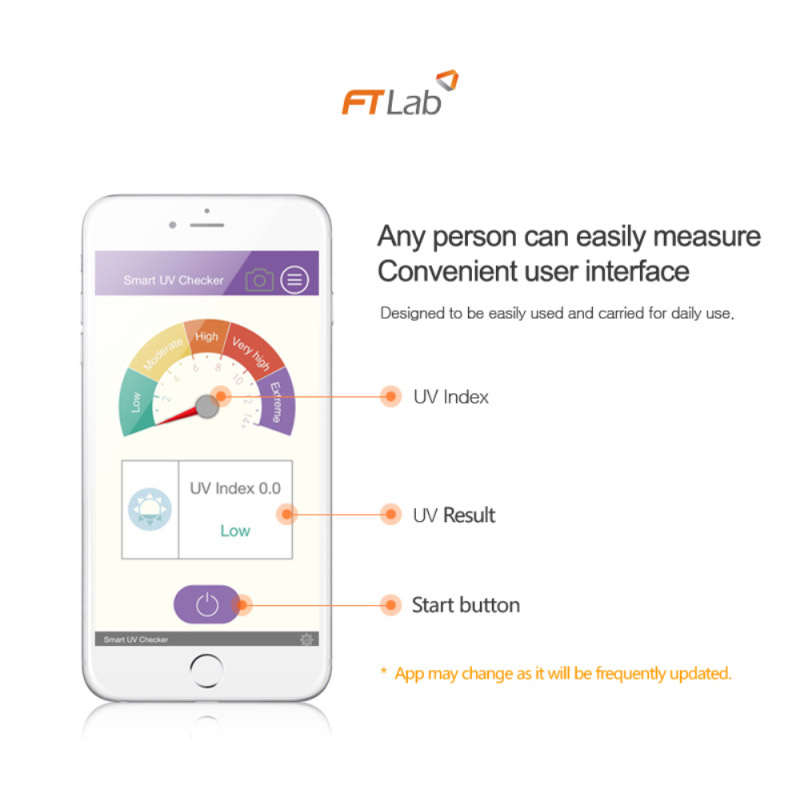 The apllication can be downloaded from the App Store / Google Play by searching "smart uv checker" or "FTLAB"