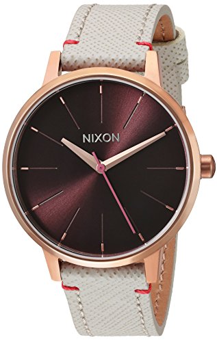 Dress up your look with the Nixon® Kensington Leather. Part of The Mahogany Rose collection. Solid stainless steel case. Hardened mineral crystal. Stainless steel snap fit caseback and spring pin lugs. Genuine leather custom band with a stainless steel buckle. Miyota Japanese quartz three-hand movement. Dial features:• Engraved and printed indices.• Custom molded hands. Water resistant up to 50 meters. Imported. Measurements: Case Height: 37 mm Case Width: 37 mm Case Depth: 9 1⁄5 mm Band Width: 2⁄3 in Band Circumference/Length: 8 1⁄4 in Weight: 1.2 oz This product may have a manufacturer's warranty. Please visit the manufacturer's website or contact us at warranty@support.zappos.com for full manufacturer warranty details.Feature