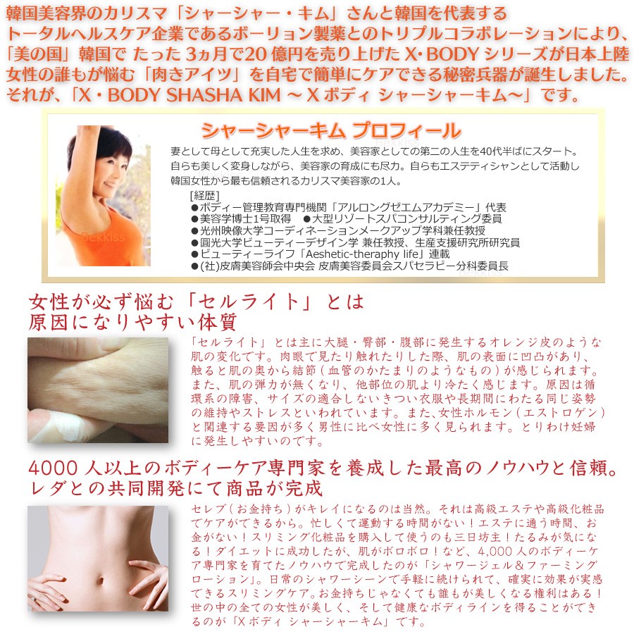 | セット内容 | シャワージェル300ml ファーミングローション300ml シリコン製シャワーグローブ シャーシャーキム使用方法シート 特別パッケージ外箱入り |