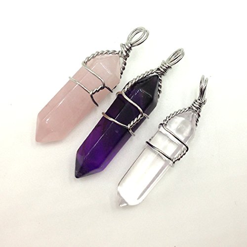 3 Double Terminated Wire Wrapped Pendant One Each of Amethyst, Quartz and Rose Quartz Pendants