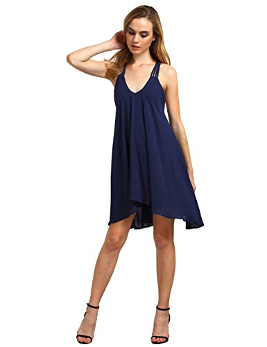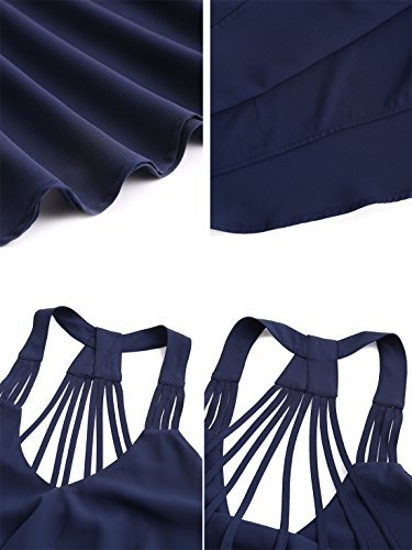 Material: 100%Polyester, light weight. Sleevless, strappy, spaghetti strap, backless, asymetrical hem.