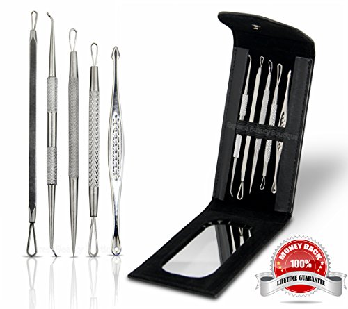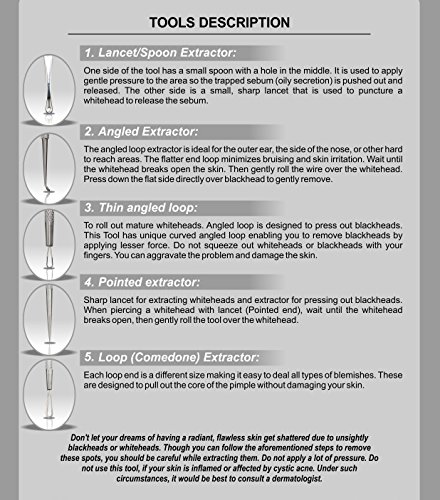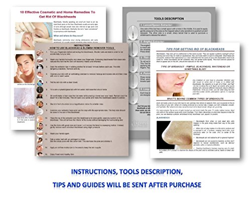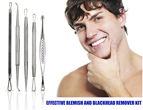 TOP QUALITY STAINLESS STEEL- This is a high quality pure stainless steel blackhead remover which is designed to remove stubborn and deep blackheads effectively. • EFFECTIVE BLEMISH AND BLACKHEAD REMOVER KIT! These 5 double end tools allow you to reach blackheads, whiteheads, pimples and blemishes without effort, even in the most difficult spots. You will how to get rid of blackheads