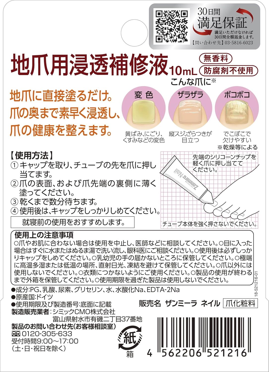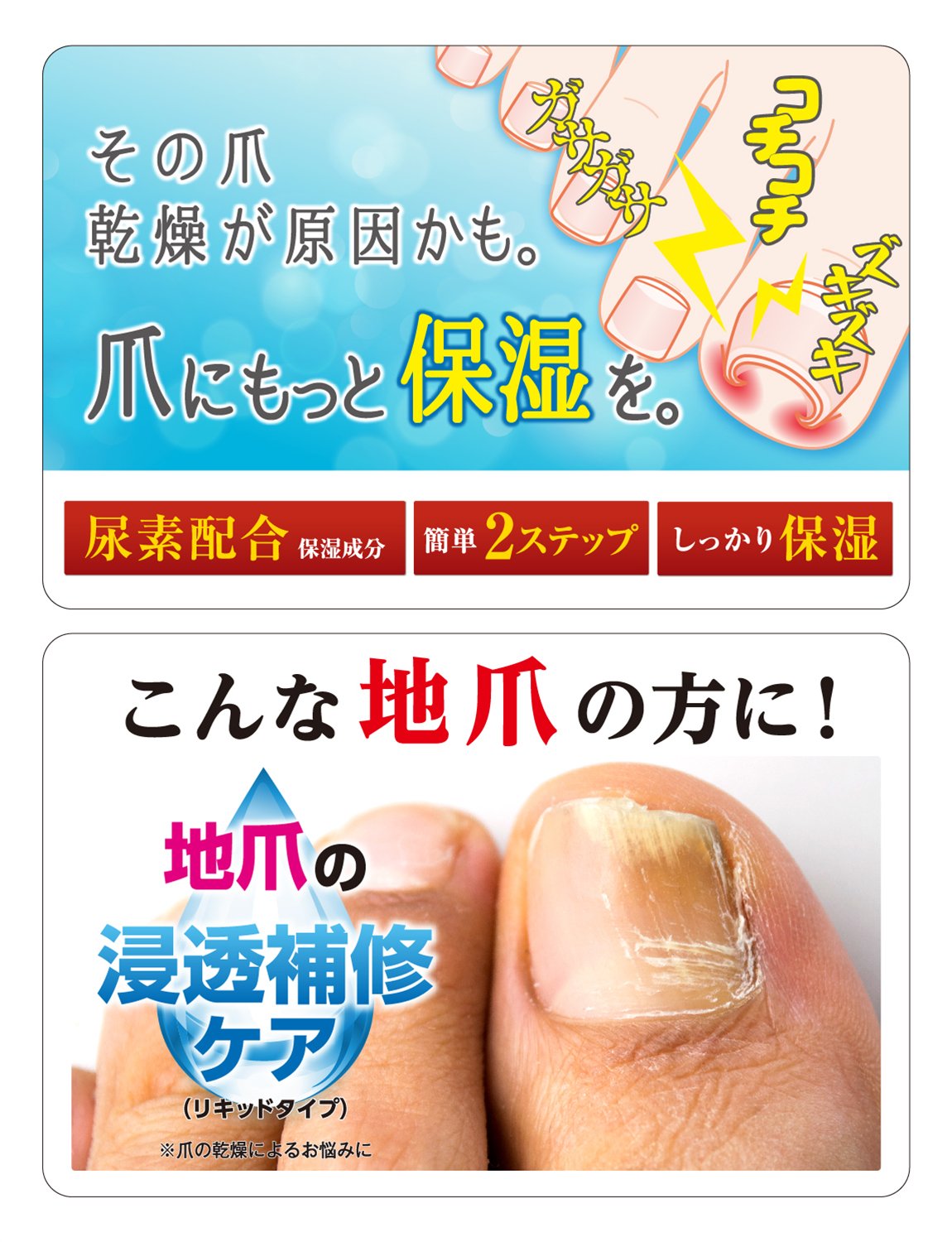 爪補修成分(尿素、乳酸、PG)がもたらすトリプルアクションで、見た目が気になる爪の色、形、質感を健康的に整えます。
