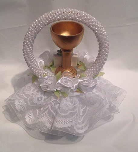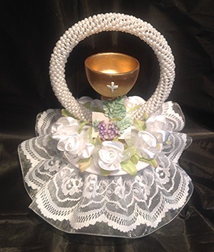 - Title : Communion Challis Cake Top with Lace Trim and Silk Flowers All in White