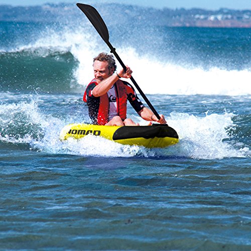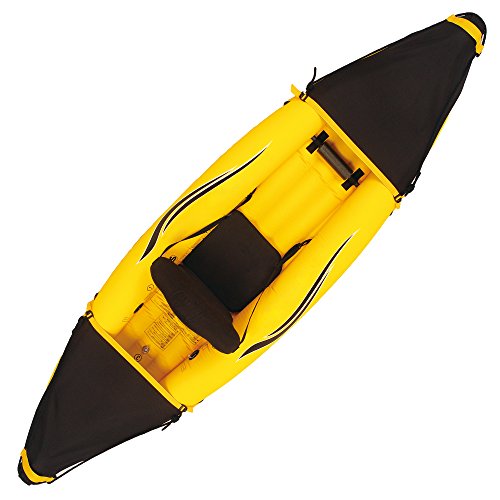 The Nomad is a lightweight, one person inflatable kayak that is perfect for enjoying lakes, rivers or streams. Its removable heavy duty fabric seat creates a secure comfortable ride for riders up to 231-lbs even in the roughest of waters. Reinforced 24 gauge laminated 3 layer PVC construction means the Nomad is super durable and rough water ready. Multi air chambers, 2 in the hull and 1 in the floor, provide a comfortable ride. Includes exclusive "Pathfinder Stabilizing Technology" - dual directional bottom fins deliver stability and control. Large grab handles and rings make the Nomad easy to carry or can be used to connect to other floats. The Nomad comes with 1 heavy duty adjustable fabric seat, a foot pump, 4-piece aluminum oar, and polyethylene carry bag for easy transport and storage. 1-year Limited Warranty.Feature