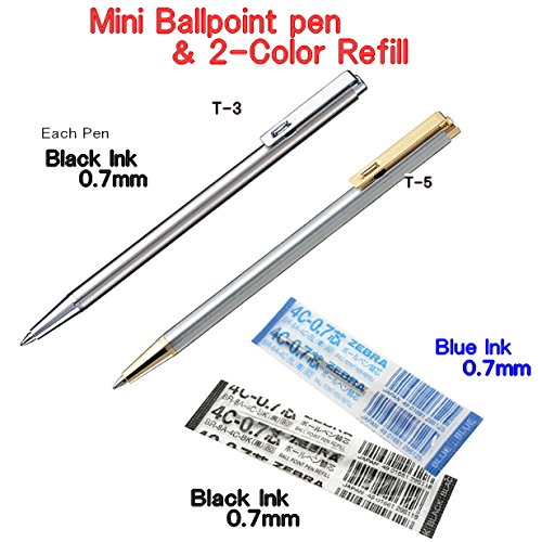 -. Title : Zebra Mini Ballpoint Pen/0.7mm Black Ink/T-3 (Silver Body) & T-5(Silver+Gold Body) each 1Pen + 2 Refills(1Black Ink & 1Blue Ink) Value Set/With Our Shop Original Product Description