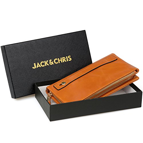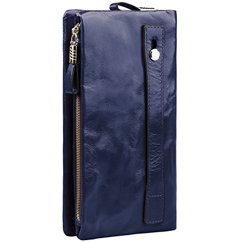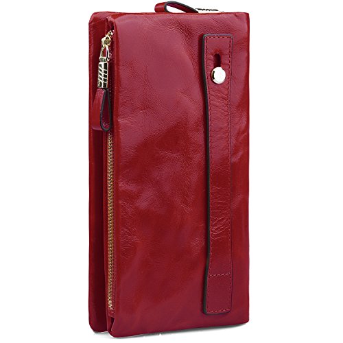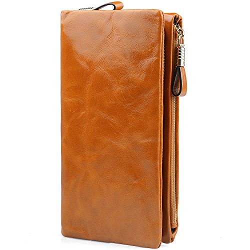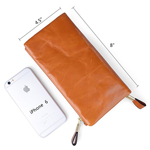 WAX & OIL LEATHER WALLET: Soft oiled and waxed genuine grain leather wallet, Glossy surface, and with high quality shiny gold brass hardware, which make the clutch wallet be luxury.