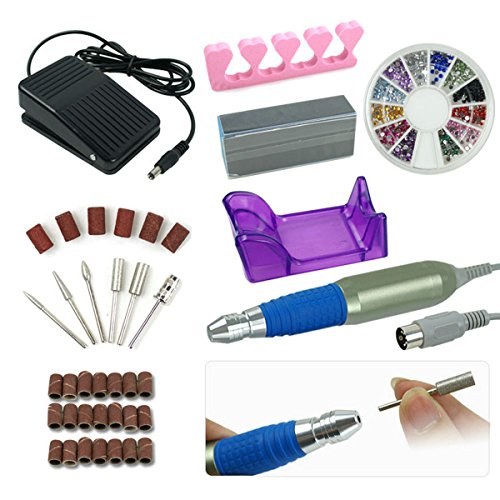 Studio : upersale Publisher : upersale Binding : Misc. Product Description Specifications Overall Size: 13.8 x 9.4 x 5.5 inches,Weight: 4.2 pounds Features: Light weight and sleak handpiece for comfortable grip Mechanical collet for security the bit firmly and easy to pull up Purple cradle for holding the handpiece Foot pedal for convenient control switch 6 optional standard 3/32" bits/filing heads (with 5 sanding bands) Easy bit change using no tools Free Gift 20 spare sanding bands Free 4-way nail art brush and finger separator (the color of separators may differ,we will send randomly) Free nail art rhinestones 600 pieces (approximately) Wheel Package Includes: 1x Electric Nail Drill Machine,1x Handpiece,1x Cradle,1x Foot Pedal 1x Nail Art Brush,1x Finger Separator,1x Nail Art Rhinestones Wheel 6x Optional Bits with 5 sanding bands,20x Extra Sanding bands,1x Manual 1x DC Power Supply,1x Output DC Probe Cable,1x Manual 0