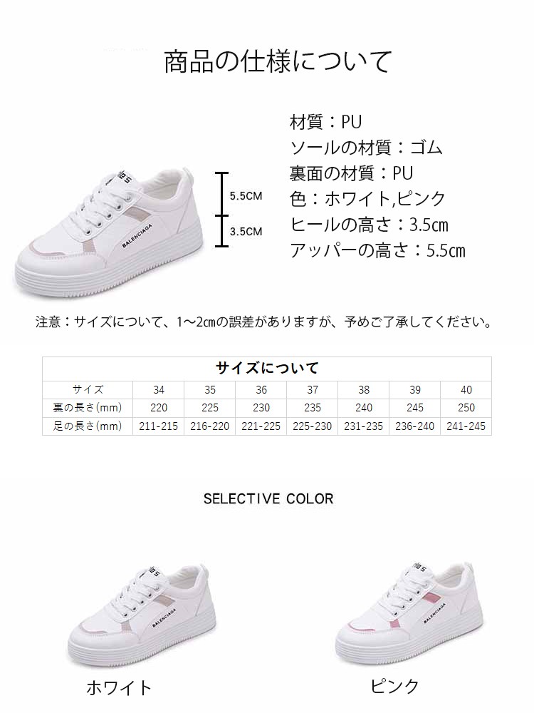 材質:PU ソールの材質:ゴム裏面の材質:PU色:ホワイト,ピンクヒールの高さ:3.5cm アッパーの高さ:5.5cmサイズ:22.5cm~24.5cmEU36=22.5cm EU36=23cm EU37=23.5cm EU38=24cm EU39=24.5cm EU40=25cm 注意:※ サイズなど、商品詳細を必ずご確認後、ご了承頂いた上でご購入をお願いします。また、採寸方法違いにより、0.5~1cmの誤差がございますので、ご了承ください。特徴:【軽量、通気性よい】ゴムのソールとキャンパスの材質でスポーツシューズならではの軽さを実現し、通気性もよいです。どんな季節でも着用します。 軽量なので、ランニングや歩くや他の運動が易くになりました。【ファッションな配色】ファッションな配色で、シューズがファッションになり、女性に最適です。中学生などに通学靴としてもよい選択です。 【ゴムのソール耐滑】柔らかい材質で作って、ゴムのソールので、耐滑のです。スムーズな足運びをサポートします。球技や他の運動にもスムーズになりました。【利用場合】スポーツだけでなく、通勤や通学やアウトドア、普段履きとしても カジュアルなコーディネートをお楽しみい ただけます。
