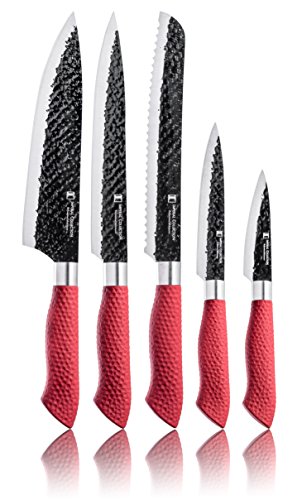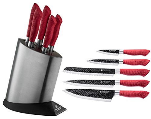 Imperial Collection IM-KST10 RED Stainless Steel Kitchen Cutlery Knife Set with Knife Block and Embossed Non-Stick Coating, 6-Piece (Red)
