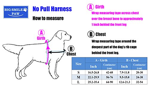 Studio : BIG SMILE PAW Publisher : BIG SMILE PAW Binding : Misc. Product Description Product Features: No Pull:two leash clips designed,the front clip on chest strap helps directional steering and discourages pulling,the top clip on back strap allows for a traditional leash leading,you will enjoy walking dogs with this harness Adjustable and Comfortable:3 adjustment points provide custom fit to your dog and the chest strap rests across your dog's chest which prevents gagging,choking and coughing Easy on and off: pull the chest strap over the head and belly strap goes around the belly, then a quick-snap buckle on the belly strap to make it easy on and off Size: **S-belly girth:16.5inch~26.8inch/42cm~68cm;chest girth:7.9inch~11.8inch/20cm~30cm; **M-belly girth:22.1inch~29.9inch/56cm~76cm;chest girth:9.5inch~15inch/24cm~38cm; **L-belly girth:25.2inch~35.4inch/64cm~90cm;chest girth:12.6nch~21.3inch/32cm~54cm Package content: 1 harness 0
