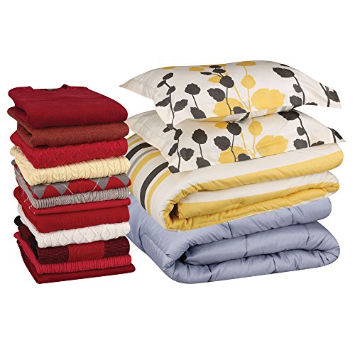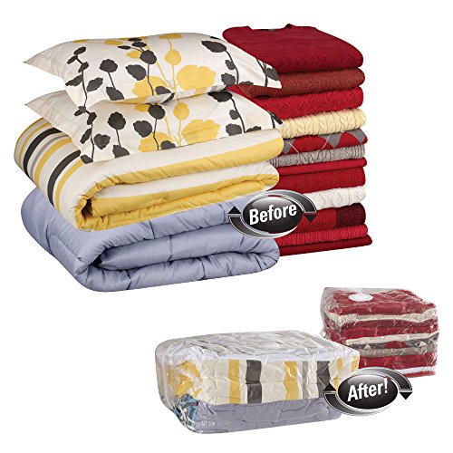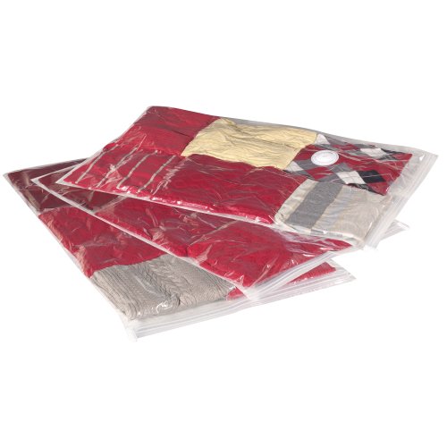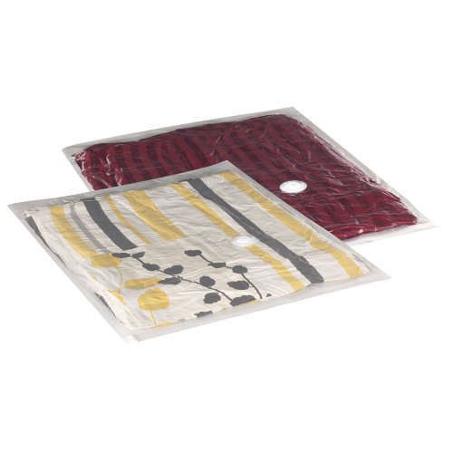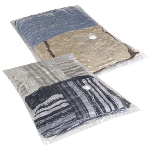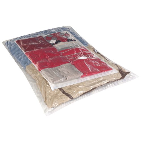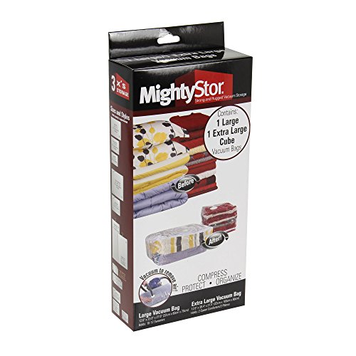The two piece combination set of MightyStor Vacuum Bag's Large storage cube and Extra Large storage cube create compact storage that fits conveniently on shelves and in closets. The cubes are created from the unique design of a gusseted bag that allows you to fill the bag upright. When air is removed, the bag shrinks around the contents to form a compact cube that can be stacked and tucked away. The Large cube fits 10-12 sweaters, making it ideal for seasonal wardrobe storage or holding clothing for the next size in line. The Extra Large cube fits up to 2 queen comforters and 2 pillows. MightyStor vacuum bags are strong and durable, designed to be used over and over again. Simply open the bag and fill. Each bag features the double, sure-lock closure for a solid seal every time. A finger grip runs the enter length of the closure, so you have an easy guide to grab and follow to press and seal your bag on the first try. When the bag is sealed, remove the air from the bag with any standard vacuum hose. The one way air valve ensures steady air removal. Your contents quickly begin to compress as the air excess air is sucked away. Vacuum Bags do what the best organized minds cannot do alone: they create space where there is none by quite literally sucking the air out of the room. By removing the excess air, your things take up less space, so you have more room for the things of daily living. Even better, when you are ready to use your stored items again, they spring back as fresh and clean as the day you put them away. MightyStor Vacuum Bags also protect and preserve your favorite and best things from the hazards of storage everywhere: mildew, moisture, insects and dirt. The bags are air-tight and water-tight, so you can store with confidence that your things are well protected. Large cube measures 12.6" x 23.6" x 27.6". Extra-large cube measures 12.6" x 39.4" x 31.5". Item No.4510.Feature