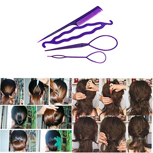 Specifications: Type: Hair Styling Material: Plastic Size: Approx. comb£º21 x 2.6 cm Hair Disk: 20.5 x 3.5 cm topsy tail: 18 x 5.3 / 14 x 3 cm Color: purple Package Content: 4 * hair braided styling tool 0