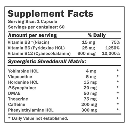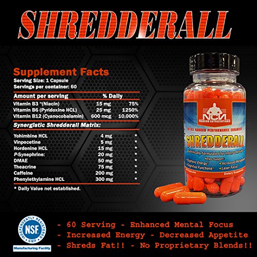 -. Feature : Morning Pick-me-up: If you're looking for clean energy first thing in the morning, take one capsule upon waking up, 30-45 minutes before consuming food or before your workout. Shredderall will provide you with clean long-lasting energy that will stay with you long into the day and beyond your workout. After you have assessed your tolerance, you may add a second capsule 4-6 hours later, although most users don't even need a second capsule because of the strength! / As a fat loss aid: We recommend a similar dosing protocol as if you were using it for a morning pick-me-up. Take one capsule 30-45 minutes before your first meal of the day and reap the benefits of long-lasting energy and appetite control. Again, first assess your tolerance before adding a second capsule 4-6 hours later. Shredderall isn't just another thermogenic aid that is going to help you drop water weight by sweating like crazy. / Pre-workout enhancement: As you would with most pre-workout products, take one capsule roughly30 minutes P.R.Ior to your workout. We don't recommend adding a second pill during your workout, but after your tolerance has been assessed, you may choose to take 2 capsules pre-workout. / As a cognitive enhancer: Shredderall can be taken at any time during the day to increase cognitive performance but we recommend not taking it within 6 hours of your bedtime. We recommend starting with that single capsule dosage on an empty stomach and get ready to experience high quality, jitter-free energy, razor-sharp focus, and positive mood support. / Includes: 1 x Bottle/60 Capsules Shredderall